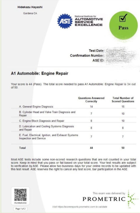 ロサンゼルスでASEのテストを受験し無事合格しました。米国最高峰の称号を取得するまであと2年程度掛かりますが継続します。